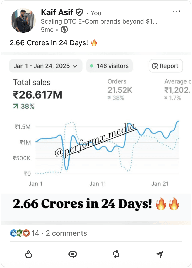 That experience became the foundation for PerformX. Since then, Kaif and his team have managed over $10M+ in ad spend and generated over $50M+ in tracked revenue for DTC brands.